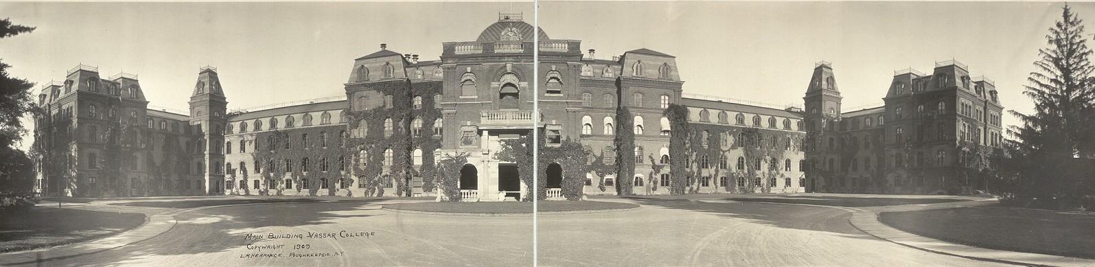 As Vassar College arose in brick and mortar, it was as an immense seminary building, designed by one of America's foremost hospital architects, James Renwick, Jr. In keeping with the newest approaches of mental asylums, Vassar College was placed on a picturesque site in the country. In a building four and five stories high and 1/5 of a mile long, the largest building in America when it was built, Renwick essentially copied the plan of Mount Holyoke, now for four hundred students and faculty. The central pavilion functioned as Mount Holyoke's principal floor, housing all the public spaces. One entered through ceremonial steps to find reception hall, parlor, dining room, chapel, museums for science and art, library, president's quarters, and classrooms. The male college faculty lived with their families in apartments in the end pavilions. Along the corridor, students lived with their teachers, the young female assistants of the professors. These women supervised their charges under the direction of a Lady Principal, who had the responsibility for creating and maintaining the seminary system, thereby attempting to control students as firmly as did Mount Holyoke. Vassar's Main Building is a fitting testimonial to the hopes and fears of offering higher learning to women.