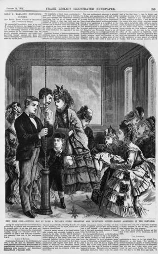Ladies ascending the elevator at opening day of Lord & Taylor's in New York City in 1873