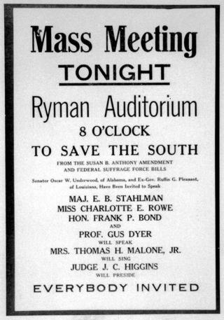 Most white southerners, however, favored the position of antisuffragists that while the traditional role of the Southern Lady precluded her direct participation in politics, her indirect, inspirational role was indispensable—a source of pride and distinction for the South. In addition, protection of white womanhood was a key element of white southern mens’ rationale for disfranchising black men they claimed would be inspired by political equality to aspire to social equality. When it appeared that southern suffragists could win the vote only by federal action and sought support for a woman suffrage amendment, evocation of Civil War references and rhetoric only increased. Politicians who had only recently adopted new policies to reverse the effect of the Fifteenth Amendment insisted that ratification of what became the Nineteenth Amendment was unthinkable. It was, they proclaimed, another federal assault on states’ rights—the fundamental principle, for which Confederates had fought and died during the Civil war. Any “true” son or daughter of the South, they insisted, would recognize that fact.
