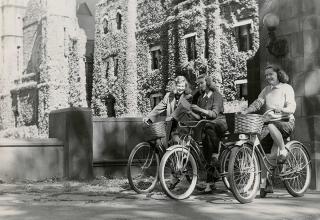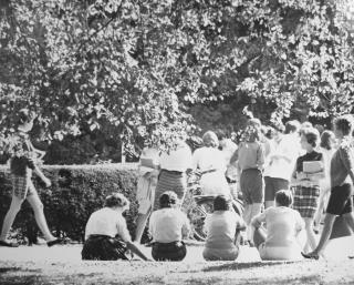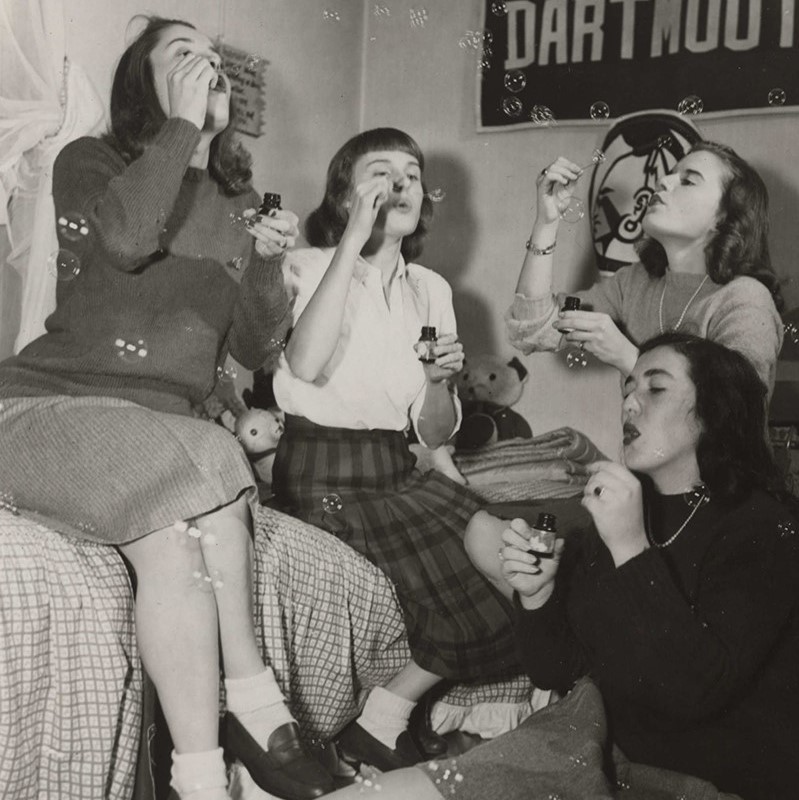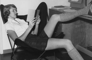 Whether eschewing hoop skirts for bloomers, or opting for denim over dirndls, the Seven Sisters were staunch advocates for comfortable campus clothing. Students emphasized taking advantage of the relative seclusion of the campus by actively embracing opportunities that would have been greatly hindered by typical feminine fashion beyond the campus gates. As such, Seven Sisters campus style came to include both menswear, for a looser fit, and athletic attire, for easier movement on and off the athletics fields. Bloomers, sweaters, and golf skirts would all evolve into the classic combination of Black Watch or flannel Bermuda shorts, oxford-cloth button-downs, crew neck Shetland sweaters, knee socks, saddle shoes, and penny loafers. This commitment to comfort was noted by Simone de Beauvoir when she visited Vassar in 1947: “In the library they seem so comfortable and free: they read curled up in deep armchairs or sitting cross legged on the floor, scattered through little rooms by themselves or gathered together in large halls […] How I envy them.”