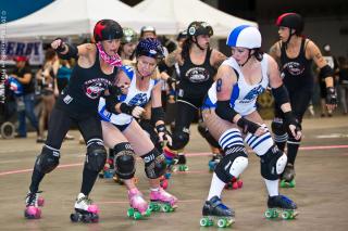 Two blockers from FoCo Girls Gone Derby (white) attempt to ward off the Pacific Roller Derby jammer (black) at the 2011 Dust Devil tournament.
