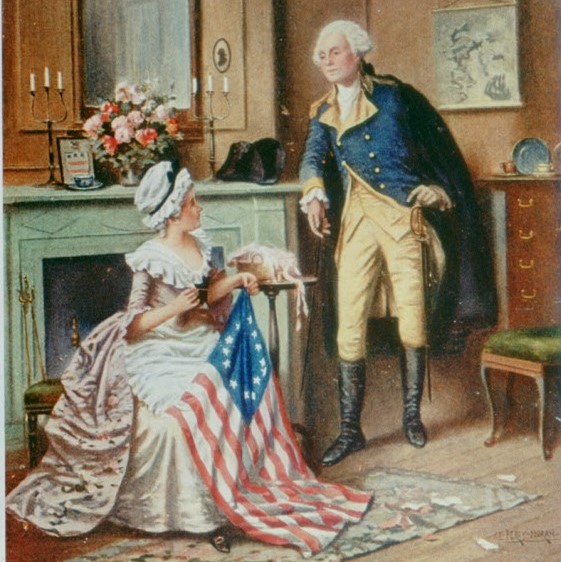 Betsy Ross, along with her husband John Ross, were upholsterers in Philadelphia, Pennsylvania. She actively worked and made money as an upholsterer and may have sewn and sold flags during the last few years of the Revolutionary War. One of the Ross’ best-known customers was General George Washington. According to period sources, on September 23, 1774, Washington made a payment for three bedcoverings to “Mr. Ross the upholsterer” in Philadelphia. It is more than likely that Mrs. Ross assisted in the creation of these bedcoverings for Washington.