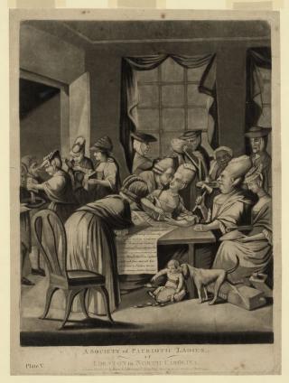 Political cartoon satirizing the women involved in the Edenton Tea Party. Published March 25, 1775 in London.