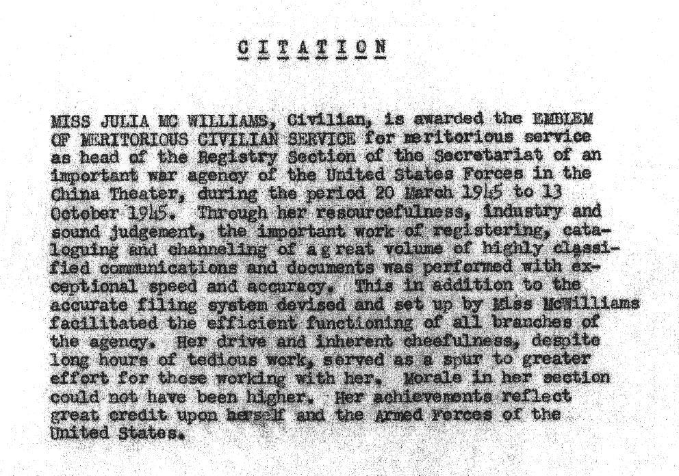 [1] United States, National Archives and Records Administration, Office of Strategic Services, Julia C. McWilliams, 31, 2008, accessed November 8, 2017, https://catalog.archives.gov/id/2180661.