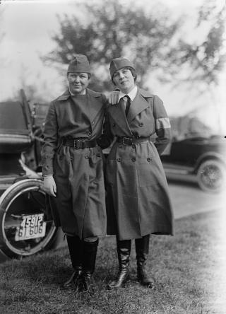 Elizabeth Langley Harris and Irene de Bruyn Robbins in the Nurses and Motor Corps parade at the dedication of the American Red Cross Building in Washington, DC, 1917.