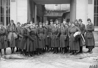 Florence Harriman, and her staff, at the garage of the American Red Cross Womens Motor Corps, 32 Rue Pierret, Neuilly Seine France, February 28, 1919.