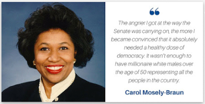 Carol Mosely-Braun was the first African American woman elected to the Senate, serving one term from 1992 to 1999. Mosely-Braun, who had held local offices in Chicago, was motivated to run by the spectacle of the US Supreme Court confirmation hearings for Clarence Thomas and the treatment of his accuser Anita Hill.