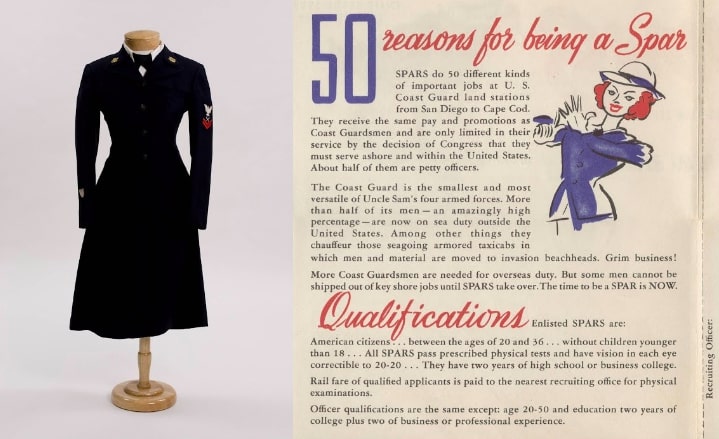 Additionally, they had to have a bachelor's degree or four years of comparable work experience. They could be up to forty-nine years old when seeking a commission.Overall, potential SPAR women were promised room and board as well as fashionable uniforms made by the haute couture design label Mainbocher. Pay was equal to what their male counterparts made.Left to right: SPAR winter uniform (United States Coast Guard, c. 1942); SPAR pamphlet listing recruitment qualifications (United States Coast Guard, c. 1943)