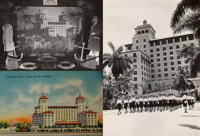 Clockwise from top left: SPAR recruitment display featuring a large image of the Palm Beach Training Center (United States Coast Guard, c. 1943); enlisted SPARs train in front of the repurposed Biltmore Hotel (United States Coast Guard, c. 1943); a postcard of the Biltmore Hotel before its conversion to a SPAR training facility (The Tichnor Brothers, c. 1940)