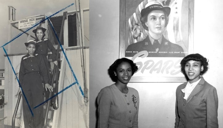 Left to right: Enlisted SPARs Olivia Hooker and Aileen Cooke pose on a ship's ladder in a photograph that includes the photographer's penciled in crop marks (United States Coast Guard, c. 1944); SPARs D. Winifred Byrd and Julia Mosley pose in front of a SPAR recruitment poster (United States Coast Guard, c. 1944)