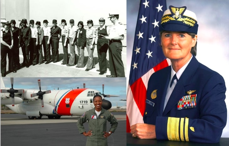 Clockwise from top left: The first Coast Guard women cleared for sea duty (United States Coast Guard, 1977); Personnel portrait of Vice Commandant Vivien S. Crea (United States Coast Guard, c. 2006); Lieutenant JG Jeanine McIntosh, the first black woman pilot in the Coast Guard (United States Coast Guard, 2006)