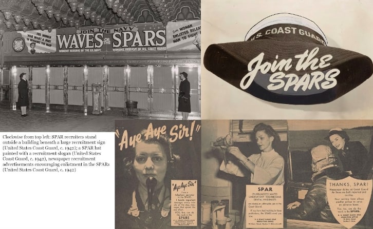 Image Collage: SPAR recruiters; a SPAR hat with a slogan, and recruitment newspaper ads circa 1942-1946