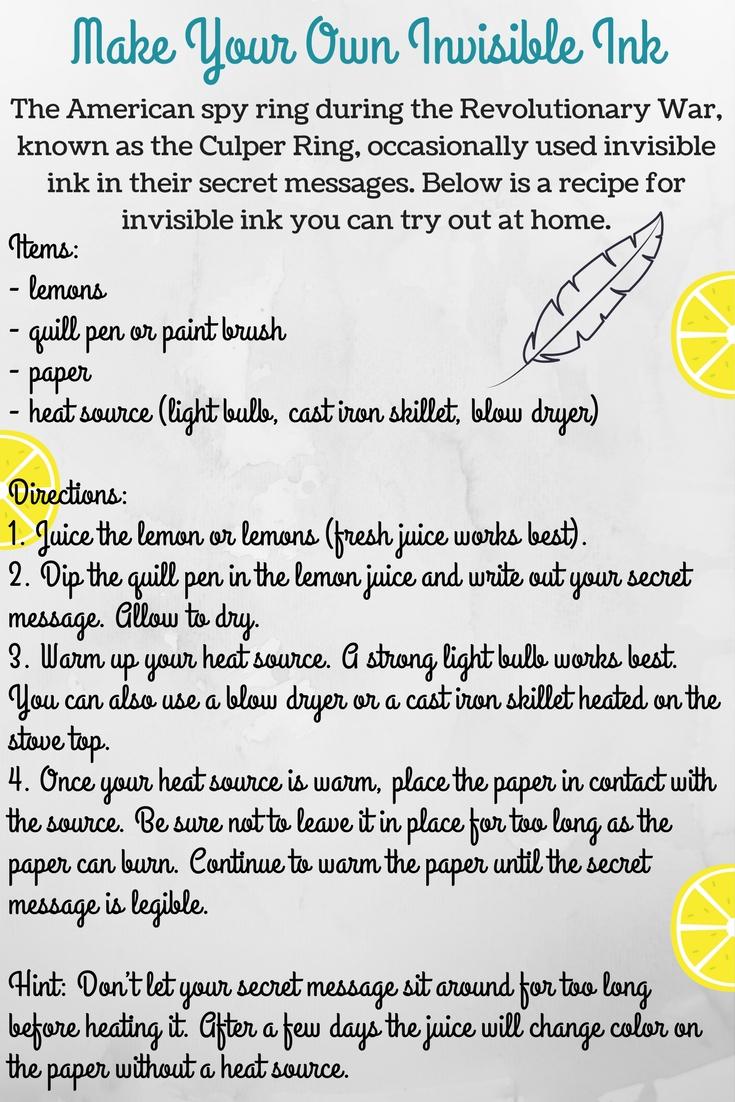 During the Revolutionary War General George Washington’s spy ring was known as the Culper Spy Ring. Occasionally they used invisible ink in their secret messages. Below is a recipe for invisible ink you can try out at home. To find out more about Anna Smith Strong who was part of the Culper Spy Ring and other Revolutionary spies check out Revolutionary Spies.