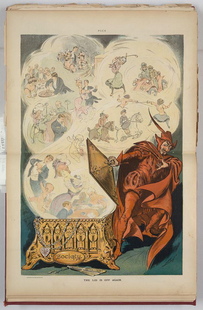 Illustration shows a devil taking the lid off a box labeled "Society" allowing fumes to escape which show the liberation of women, such as being granted divorces, horseback riding, driving automobiles, gambling, and smoking in social situations.